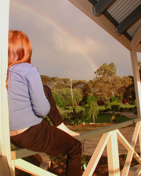 youngest girl in front of the rainbow.